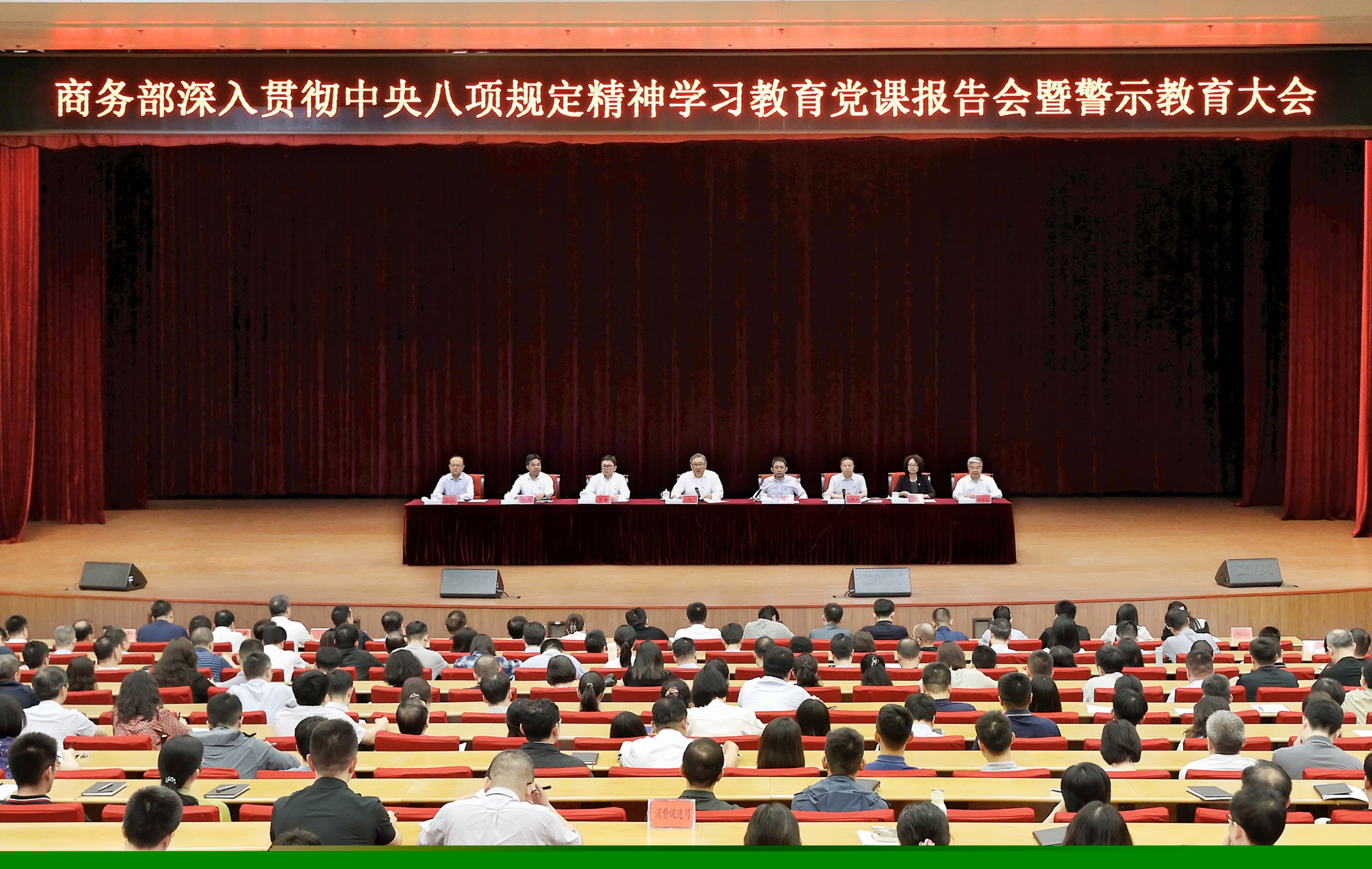 7月1日,商务部召开深入贯彻中央八项规定精神学习教育党课报告会暨警示教育大会,深入学习领会习近平总书记关于加强党的作风建设的重要论述和重要指示批示精神,现场观看警示教育片,开展以案说德、以案说纪、以案说法、以案说责,引导党员干部锲而不舍深入贯彻中央八项规定精神,以作风建设新成效开创商务高质量发展新局面。部党组书记、部长王文涛主持会议并讲专题党课,部党组成员、中央纪委国家监委驻商务部纪检监察组组长涂更新通报违反中央八项规定精神典型案例并提出要求。其他部领导出席会议。